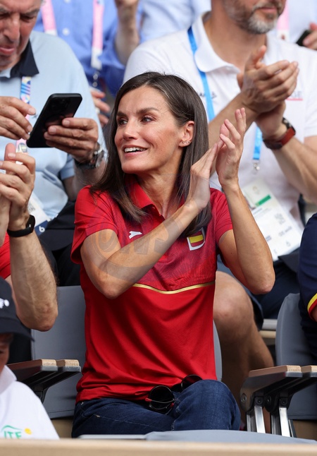 La reine Letizia d’Espagne assiste aux 1/4 de finale de tennis entre Carlos Alcaraz et Tommy Paul lors des Jeux Olympiques de Paris2024 (JO) à Roland Garros