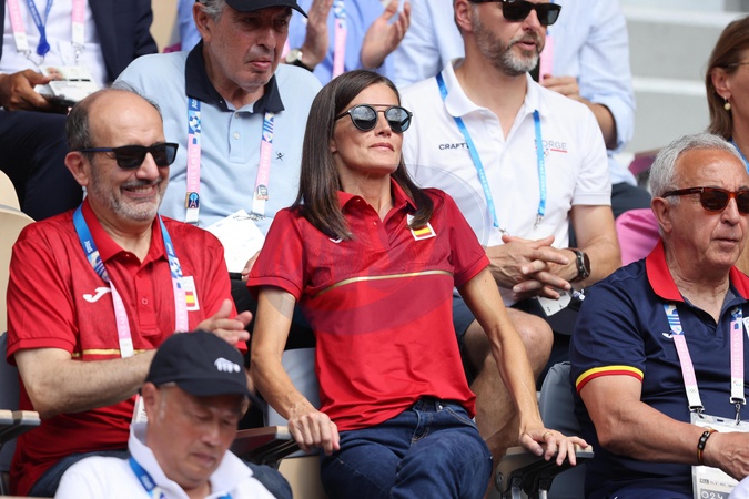 La reine Letizia d’Espagne assiste aux 1/4 de finale de tennis entre Carlos Alcaraz et Tommy Paul lors des Jeux Olympiques de Paris2024 (JO) à Roland Garros