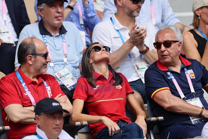 La reine Letizia d’Espagne assiste aux 1/4 de finale de tennis entre Carlos Alcaraz et Tommy Paul lors des Jeux Olympiques de Paris2024 (JO) à Roland Garros