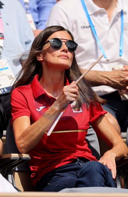 La reine Letizia d’Espagne assiste aux 1/4 de finale de tennis entre Carlos Alcaraz et Tommy Paul lors des Jeux Olympiques de Paris2024 (JO) à Roland Garros