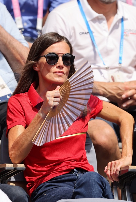 La reine Letizia d’Espagne assiste aux 1/4 de finale de tennis entre Carlos Alcaraz et Tommy Paul lors des Jeux Olympiques de Paris2024 (JO) à Roland Garros