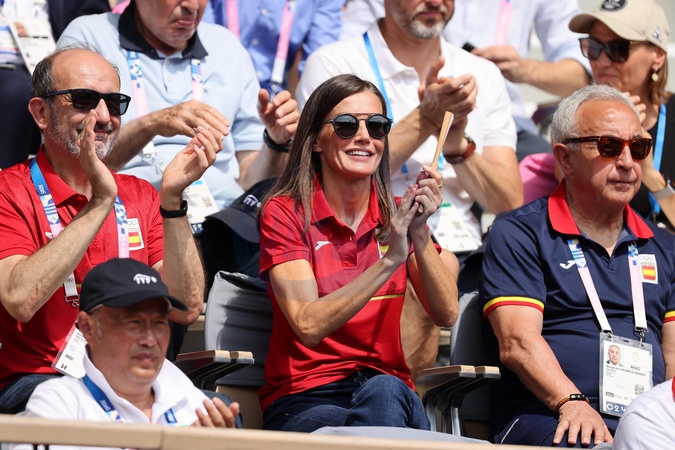 La reine Letizia d’Espagne assiste aux 1/4 de finale de tennis entre Carlos Alcaraz et Tommy Paul lors des Jeux Olympiques de Paris2024 (JO) à Roland Garros