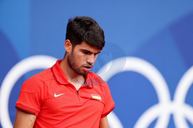 Carlos Alcaraz assiste aux 1/4 de finale de tennis entre Carlos Alcaraz et Tommy Paul lors des Jeux Olympiques de Paris2024 (JO) à Roland Garros