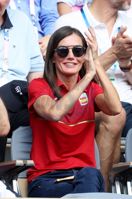 La reine Letizia d’Espagne assiste aux 1/4 de finale de tennis entre Carlos Alcaraz et Tommy Paul lors des Jeux Olympiques de Paris2024 (JO) à Roland Garros
