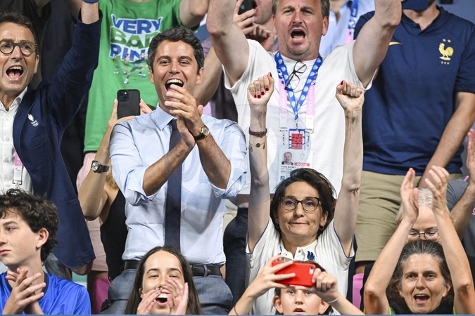 Gilles Erb, Gabriel Attal et Amélie Oudéa-Castéra - Les célébrités assistent à la victoire du français Félix Lebrun en quart de finale des épreuves de tennis de table lors des Jeux Olympiques de Paris 2024 (JO) à l'Arena Paris Sud, à Paris, France, le 1er août 2024. © Jacovides-Perusseau/Bestimage Celebrities attend the victory of Frenchman Félix Lebrun in the quarterfinals of the table tennis events during the Paris 2024 Olympic Games (Olympics) at Arena Paris Sud in Paris, France, August 1, 2024.