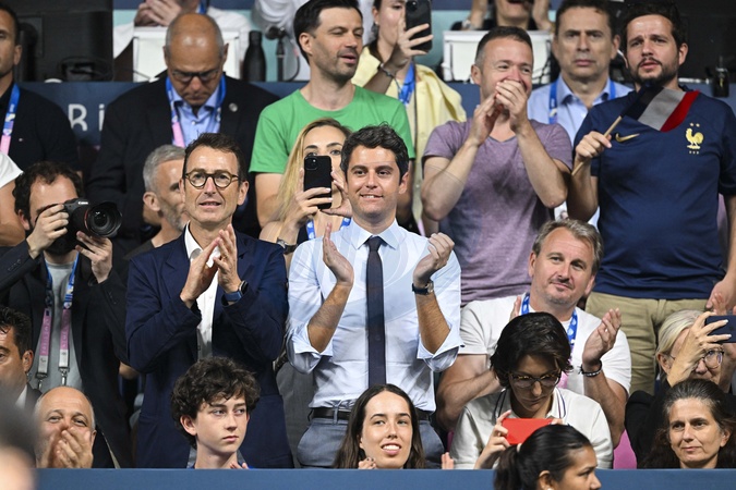 Gilles Erb, Gabriel Attal et Amélie Oudéa-Castéra - Les célébrités assistent à la victoire du français Félix Lebrun en quart de finale des épreuves de tennis de table lors des Jeux Olympiques de Paris 2024 (JO) à l'Arena Paris Sud, à Paris, France, le 1er août 2024. © Jacovides-Perusseau/Bestimage Celebrities attend the victory of Frenchman Félix Lebrun in the quarterfinals of the table tennis events during the Paris 2024 Olympic Games (Olympics) at Arena Paris Sud in Paris, France, August 1, 2024.