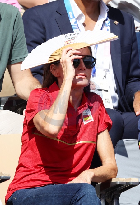 La reine Letizia d’Espagne assiste aux 1/4 de finale de tennis entre Carlos Alcaraz et Tommy Paul lors des Jeux Olympiques de Paris2024 (JO) à Roland Garros