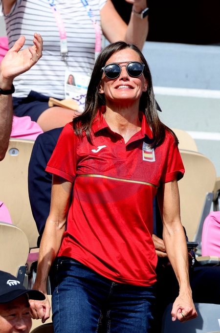 La reine Letizia d’Espagne assiste aux 1/4 de finale de tennis entre Carlos Alcaraz et Tommy Paul lors des Jeux Olympiques de Paris2024 (JO) à Roland Garros