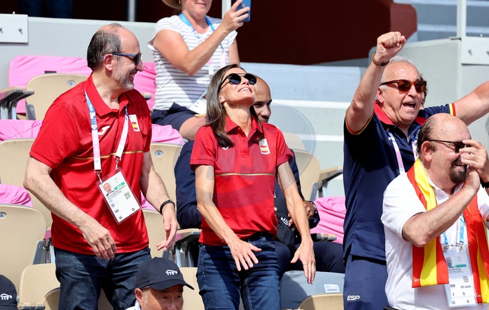 La reine Letizia d’Espagne assiste aux 1/4 de finale de tennis entre Carlos Alcaraz et Tommy Paul lors des Jeux Olympiques de Paris2024 (JO) à Roland Garros