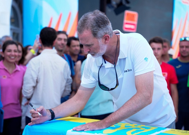 Król Hiszpanii Felipe VI podpisuje ukraińskie flagi dzieciom w Plama Yacht Club na Majorce przed Copa del Rey