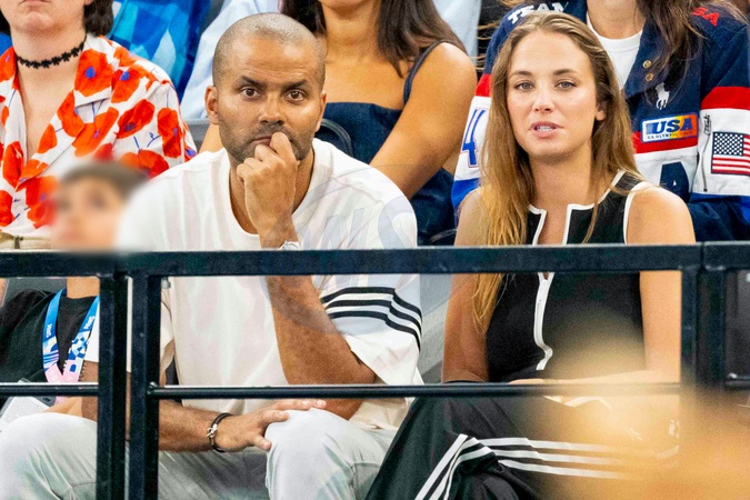 Tony Parker avec sa compagne Agathe Teyssier - Les célébrités assistent aux épreuves de Gymnastique artistique féminine, finale du concours général lors des Jeux Olympiques de Paris 2024 (JO) au Palais omnisports Bercy Arena, à Paris, France, le 1er août 20241. © Jacovides-Perusseau/Bestimage Celebrities attend the Women's Artistic Gymnastics All-Around Final during the Paris 2024 Olympic Games (Olympics) at Palais Omnisports Bercy Arena in Paris, France, August 1, 20241.