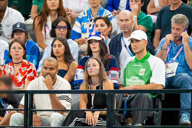 Zinédine Zidane, sa femme Véronique, Kendall Jenner, Tony Parker avec sa compagne Agathe Teyssier - Les célébrités assistent aux épreuves de Gymnastique artistique féminine, finale du concours général lors des Jeux Olympiques de Paris 2024 (JO) au Palais omnisports Bercy Arena, à Paris, France, le 1er août 20241. © Jacovides-Perusseau/Bestimage Celebrities attend the Women's Artistic Gymnastics All-Around Final during the Paris 2024 Olympic Games (Olympics) at Palais Omnisports Bercy Arena in Paris, France, August 1, 20241.