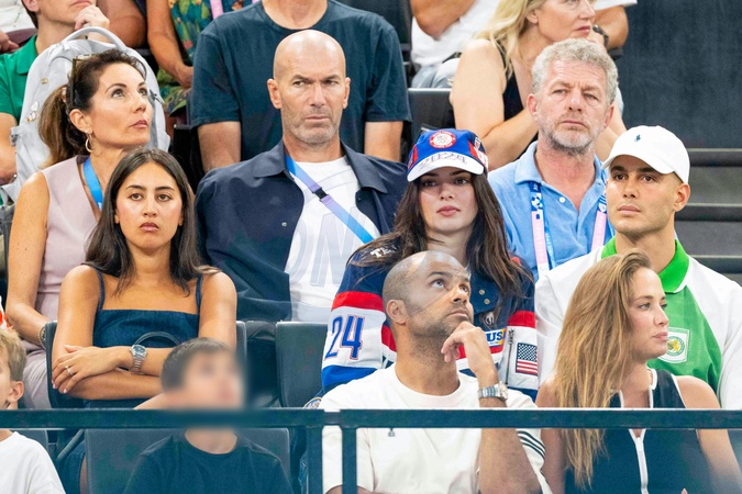 Zinédine Zidane, sa femme Véronique, Kendall Jenner, Tony Parker avec sa compagne Agathe Teyssier - Les célébrités assistent aux épreuves de Gymnastique artistique féminine, finale du concours général lors des Jeux Olympiques de Paris 2024 (JO) au Palais omnisports Bercy Arena, à Paris, France, le 1er août 20241. © Jacovides-Perusseau/Bestimage Celebrities attend the Women's Artistic Gymnastics All-Around Final during the Paris 2024 Olympic Games (Olympics) at Palais Omnisports Bercy Arena in Paris, France, August 1, 20241.