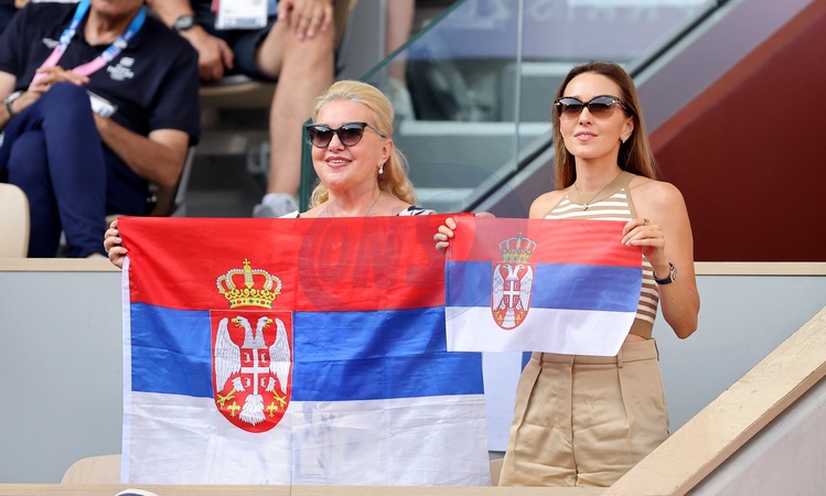 Jelena Djokovic accompagnée des parents de Novak Djokovic - Les célébrités assistent à l'épreuve de tennis du quart de finale Novak Djokovic contre Stefanos Tsitsipas lors des Jeux Olympiques de Paris 2024 (JO) à Roland Garros, à Paris, France, le 1er août 2024. © Jacovides-Perusseau/Bestimage Celebrities attend the quarterfinal tennis match between Novak Djokovic and Stefanos Tsitsipas during the Paris 2024 Olympic Games (Olympics) at Roland Garros in Paris, France, on August 1, 2024.