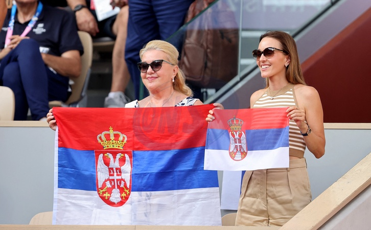 Jelena Djokovic accompagnée des parents de Novak Djokovic - Les célébrités assistent à l'épreuve de tennis du quart de finale Novak Djokovic contre Stefanos Tsitsipas lors des Jeux Olympiques de Paris 2024 (JO) à Roland Garros, à Paris, France, le 1er août 2024. © Jacovides-Perusseau/Bestimage Celebrities attend the quarterfinal tennis match between Novak Djokovic and Stefanos Tsitsipas during the Paris 2024 Olympic Games (Olympics) at Roland Garros in Paris, France, on August 1, 2024.