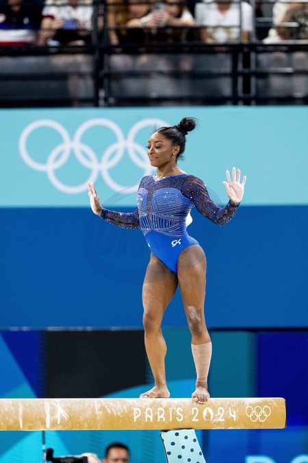 Simone Biles przed swoim towarzyszem Jonathanem Owensem oraz jej rodzicami Nellie Biles i Ronaldem Bilesem podczas zawodów gimnastyki artystycznej kobiet, wszechstronnego finału podczas Igrzysk Olimpijskich w Paryżu w 2024 r.