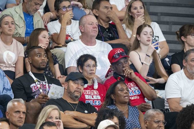 Simone Biles devant son compagnon Jonathan Owens et ses parents Nellie Biles et Ronald Biles lors des épreuves de Gymnastique artistique féminine, finale du concours général lors des Jeux Olympiques de Paris 2024 (JO)