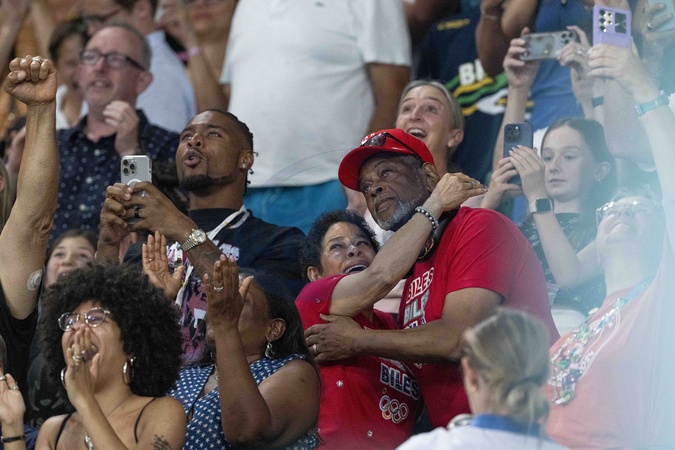 Simone Biles przed swoim towarzyszem Jonathanem Owensem oraz jej rodzicami Nellie Biles i Ronaldem Bilesem podczas zawodów gimnastyki artystycznej kobiet, wszechstronnego finału podczas Igrzysk Olimpijskich w Paryżu w 2024 r.