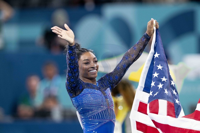 Simone Biles przed swoim towarzyszem Jonathanem Owensem oraz jej rodzicami Nellie Biles i Ronaldem Bilesem podczas zawodów gimnastyki artystycznej kobiet, wszechstronnego finału podczas Igrzysk Olimpijskich w Paryżu w 2024 r.