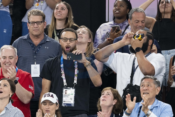 Stephen Curry - Les célébrités assistent aux épreuves de Gymnastique artistique féminine, finale du concours général lors des Jeux Olympiques de Paris 2024 (JO) au Palais omnisports Bercy Arena, à Paris, France, le 1er août 2024. © Jacovides-Perusseau/Bestimage Celebrities attend the Women's Artistic Gymnastics All-Around Final during the Paris 2024 Olympic Games (Olympics) at Palais Omnisports Bercy Arena in Paris, France, August 1, 2024