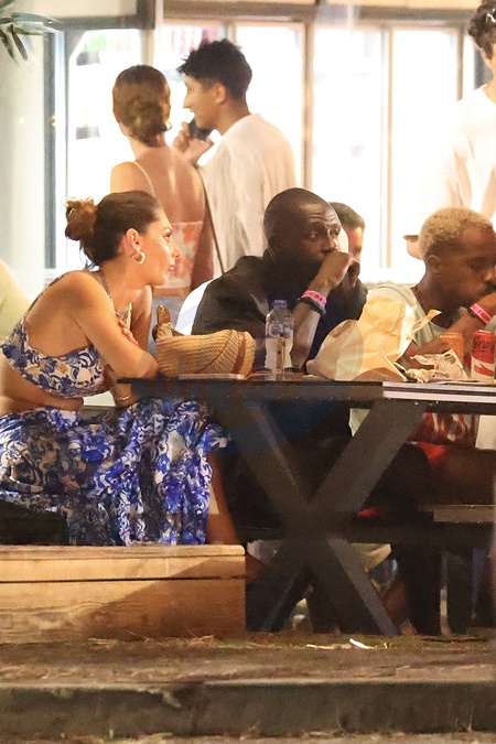 Exclusif - Prix spécial - No Web - Malgré ses multiples mises en examen pour viols et agressions sexuelles, l'ancien joueur de football de Manchester City Benjamin Mendy dîne en charmantes compagnies dans un restaurant de Saint-Tropez le 1er aout 2024. Le défenseur international français, qui risquait la prison à vie, a été déclaré non-coupable de six chefs d'accusation au terme d'un procès de plus de six mois. Exclusive - For Germany call for price - Despite his multiple indictments for rape and sexual assault, former Manchester City football player Benjamin Mendy dines in charming company in a restaurant in Saint-Tropez on August 1, 2024. The French international defender, who was facing life in prison, was found not guilty of six charges after a trial lasting more than six months.