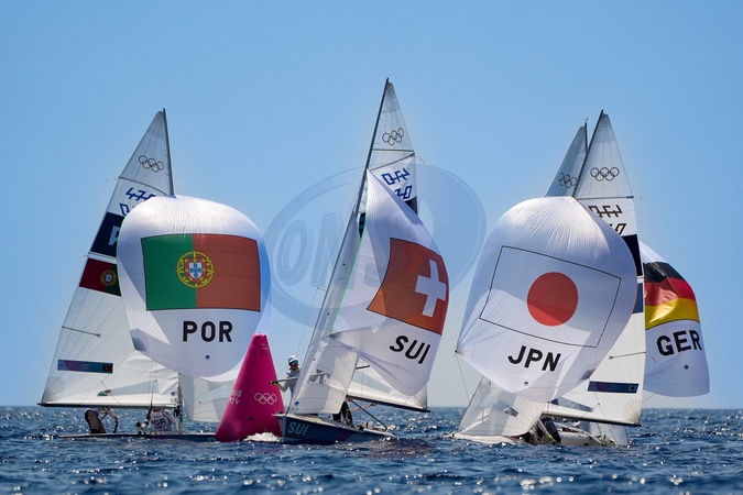 Passing the buoy during Mixed Dinghy race - Sailing, during the Olympic Games Paris 2024