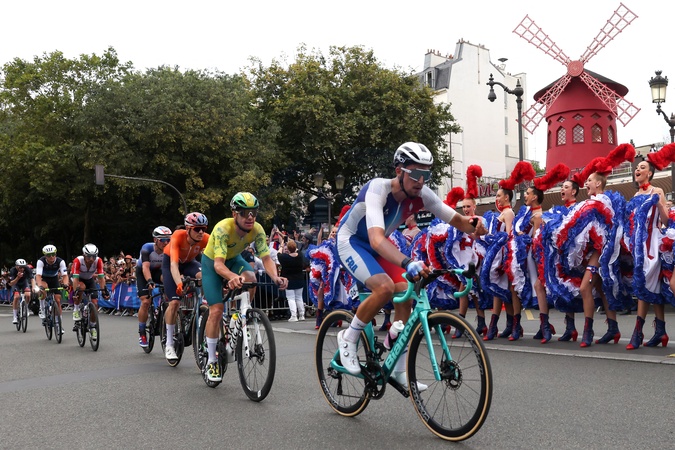 Tancerze Moulin Rouge wspierają rowerzystów podczas Igrzysk Olimpijskich w Paryżu w 2024 r