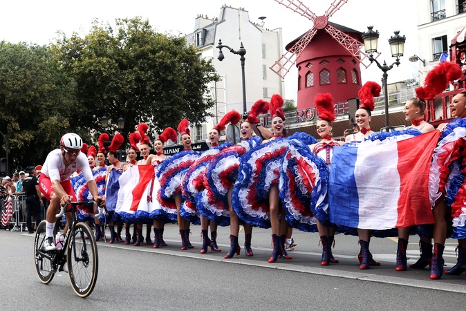 Tancerze Moulin Rouge wspierają rowerzystów podczas Igrzysk Olimpijskich w Paryżu w 2024 r