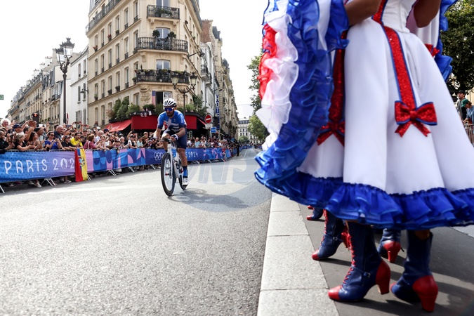 Tancerze Moulin Rouge wspierają rowerzystów podczas Igrzysk Olimpijskich w Paryżu w 2024 r