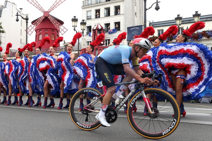 Tancerze Moulin Rouge wspierają rowerzystów podczas Igrzysk Olimpijskich w Paryżu w 2024 r