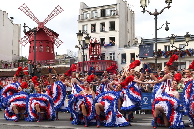 Tancerze Moulin Rouge wspierają rowerzystów podczas Igrzysk Olimpijskich w Paryżu w 2024 r