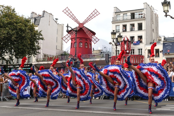Tancerze Moulin Rouge wspierają rowerzystów podczas Igrzysk Olimpijskich w Paryżu w 2024 r