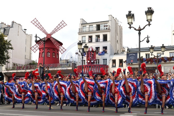 Les danseuses du Moulin Rouge supportent less coureurs cyclistes lors des Jeux Olympiques de Paris2024 (JO)