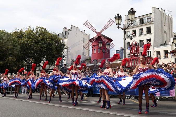 Tancerze Moulin Rouge wspierają rowerzystów podczas Igrzysk Olimpijskich w Paryżu w 2024 r