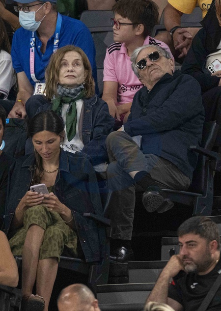 Isabelle Huppert et son mari Ronald Chammah - Célébrités assistent aux épreuves de gymnastique lors des Jeux Olympiques de Paris2024 (JO) le 3 aout 2024. © Perusseau-Jacovides-Bestimage Celebrities attend the gymnastics events during the Paris 2024 Summer Olympics (Olympic Games) on August 3, 2024.