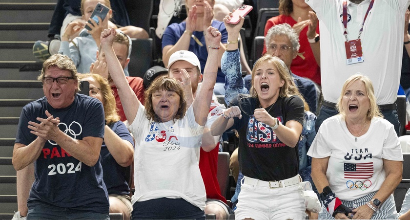 La petite amie de Stephen Nedoroscik, Tess McCracken avec sa mère et les parents de Stephen - Célébrités assistent aux épreuves de gymnastique lors des Jeux Olympiques de Paris2024 (JO) le 3 aout 2024. © Perusseau-Jacovides-Bestimage Celebrities attend the gymnastics events during the Paris 2024 Summer Olympics (Olympic Games) on August 3, 2024.