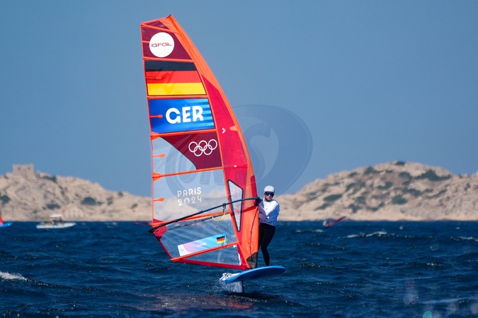 Theresa Marie Steinlein (Germany) during the final women's windsurfing Medal Race - Sailing, during the Olympic Games Paris 2024. (Photo Norbert Scanella / DPPI Media / Panoramic)