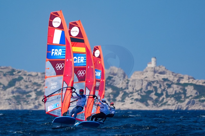 Helene Noesmoen (France) , Theresa Marie Steinlein (Germany) and Zheng Yan (People's Republic of China) during the final women's windsurfing Medal Race - Sailing, during the Olympic Games Paris 2024. (Photo Norbert Scanella / DPPI Media / Panoramic)