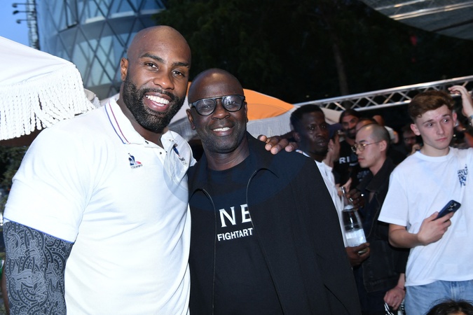 Exclusif - Prix Spécial - No Web - Teddy Riner et Lilian Thuram - Teddy Riner fête son titre de champion Olympique de judo +100KG au restaurant "Podium" du groupe (Les bistrots Pas Parisiens) à Paris le 2 aout 2024. © Rachid Bellak/Bestimage Exclusive - For Germany call for price - No Web - Teddy Riner celebrates his Olympic judo champion title +100KG at the group's "Podium" restaurant (Les bistrots Pas Parisiens) in Paris on August 2, 2024 No Web For Belgium and Switzerland