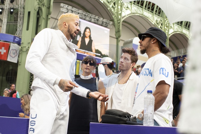 Miles Chamley-Watson, Lewis Hamilton, Shaun White et sa compagne Nina Dobrev - Les célébrités dans les tribunes de l'épreuve d'Escrime au Grand Palais lors des Jeux Olympiques de Paris2024 (JO), le 4 août 2024. © Perusseau-Jacovides-Bestimage Celebrities in the stands of the Fencing event at the Grand Palais during the Paris2024 Olympic Games (Olympics), August 4, 2024.