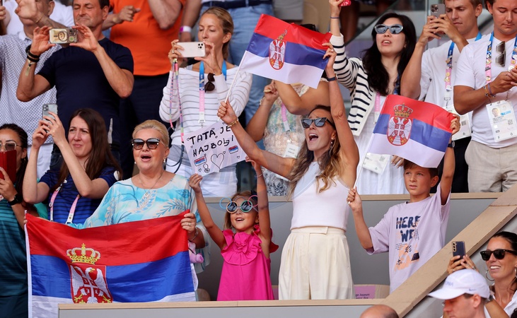 Jelena Djokovic entourée de ses enfants Tara et Stefan- Célébrités assistent à la victoire de Novak Djokovic face à Carlos Alcaraz lors de la finale de tennis des Jeux Olympiques de Paris 2024 (JO) sur le cour Philippe Chatrier à Roland Garros, à Paris, France, le 4 Aout 2024. © Jacovides-Perusseau/Bestimage Celebrities attend Novak Djokovic's victory over Carlos Alcaraz in the Paris 2024 Olympic Games (Olympics) tennis final on Philippe Chatrier Court at Roland Garros in Paris, France, August 4, 2024.