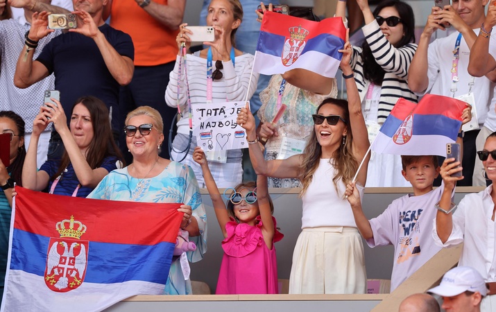 Jelena Djokovic entourée de ses enfants Tara et Stefan- Célébrités assistent à la victoire de Novak Djokovic face à Carlos Alcaraz lors de la finale de tennis des Jeux Olympiques de Paris 2024 (JO) sur le cour Philippe Chatrier à Roland Garros, à Paris, France, le 4 Aout 2024. © Jacovides-Perusseau/Bestimage Celebrities attend Novak Djokovic's victory over Carlos Alcaraz in the Paris 2024 Olympic Games (Olympics) tennis final on Philippe Chatrier Court at Roland Garros in Paris, France, August 4, 2024.