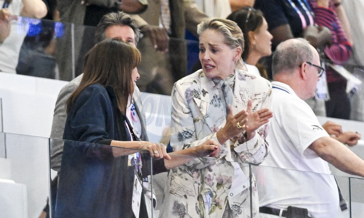 Anne Hidalgo et Sharon Stone - Célébrités assistent à la finale homme du 100m au Stade de France lors des Jeux Olympiques de Paris2024 (JO) le 4 aout 2024. © Perusseau-Jacovides/Bestimage Celebrities attend the men's 100m final at Stade de France during the Paris2024 Olympic Games (Olympics) on August 4, 2024.