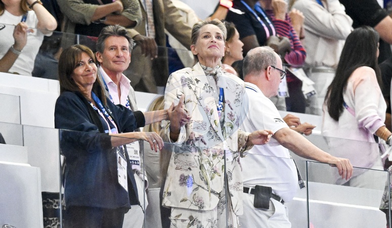 Anne Hidalgo, Sebastian Coe et Sharon Stone - Célébrités assistent à la finale homme du 100m au Stade de France lors des Jeux Olympiques de Paris2024 (JO) le 4 aout 2024. © Perusseau-Jacovides/Bestimage Celebrities attend the men's 100m final at Stade de France during the Paris2024 Olympic Games (Olympics) on August 4, 2024.