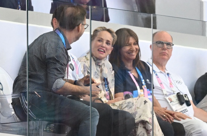 Sharon Stone, Anne Hidalgo, Le prince Albert II de Monaco - Célébrités assistent à la finale homme du 100m au Stade de France lors des Jeux Olympiques de Paris2024 (JO) le 4 aout 2024. © Perusseau-Jacovides/Bestimage Celebrities attend the men's 100m final at Stade de France during the Paris2024 Olympic Games (Olympics) on August 4, 2024.