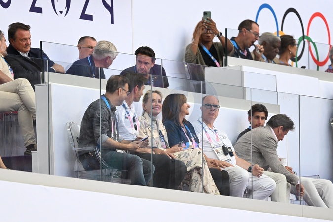 Sharon Stone, Anne Hidalgo, Le prince Albert II de Monaco - Célébrités assistent à la finale homme du 100m au Stade de France lors des Jeux Olympiques de Paris2024 (JO) le 4 aout 2024. © Perusseau-Jacovides/Bestimage Celebrities attend the men's 100m final at Stade de France during the Paris2024 Olympic Games (Olympics) on August 4, 2024.