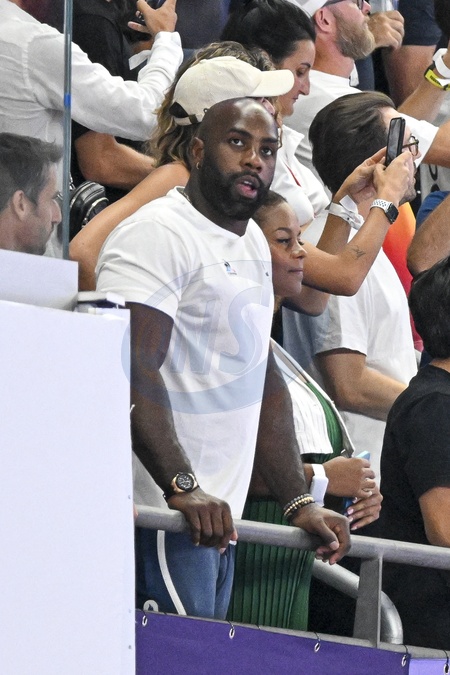 Teddy Riner et sa femme - Célébrités assistent à la finale homme du 100m au Stade de France lors des Jeux Olympiques de Paris2024 (JO) le 4 aout 2024. © Perusseau-Jacovides/Bestimage Celebrities attend the men's 100m final at Stade de France during the Paris2024 Olympic Games (Olympics) on August 4, 2024.