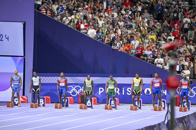Gwiazdy na finale biegu na 100 m mężczyzn na Stade de France podczas Igrzysk Olimpijskich w Paryżu w 2024 r.