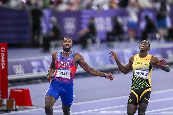 Noah Lyles, Seville - Célébrités assistent à la finale homme du 100m au Stade de France lors des Jeux Olympiques de Paris2024 (JO) le 4 aout 2024. © Perusseau-Jacovides/Bestimage Celebrities attend the men's 100m final at Stade de France during the Paris2024 Olympic Games (Olympics) on August 4, 2024.