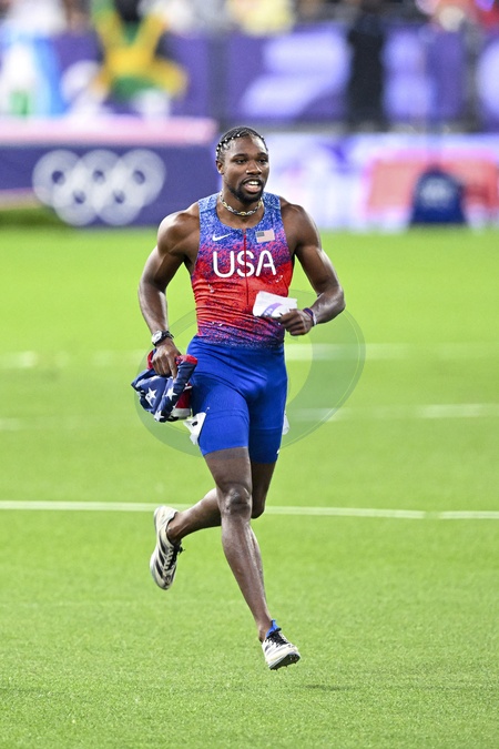 Noah Lyles - Célébrités assistent à la finale homme du 100m au Stade de France lors des Jeux Olympiques de Paris2024 (JO) le 4 aout 2024. © Perusseau-Jacovides/Bestimage Celebrities attend the men's 100m final at Stade de France during the Paris2024 Olympic Games (Olympics) on August 4, 2024.